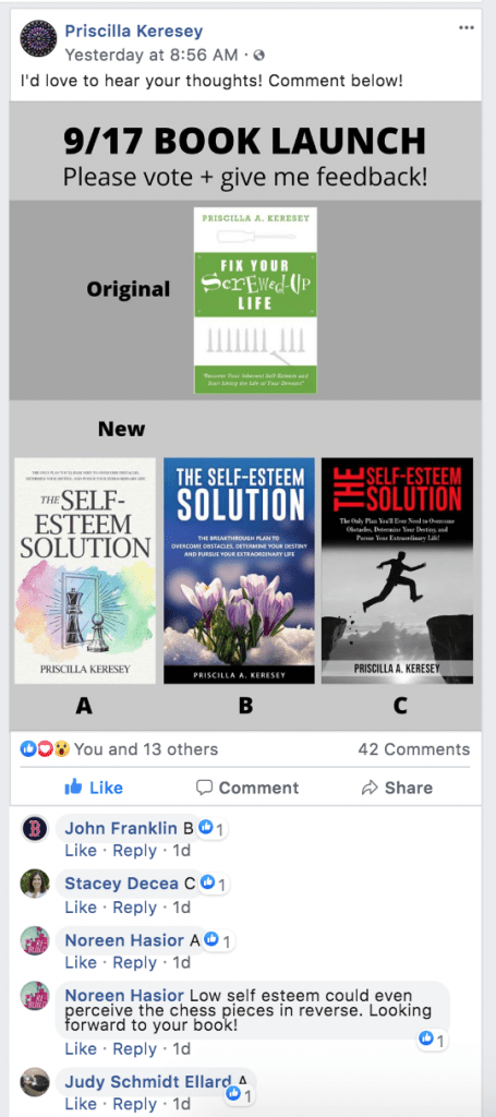 • Posts with a visual where you ask people to vote or give you feedback. For example, create a fast side by side image in Canva.com with 3 variations of your book cover (even if you already decided on what you want) and post it asking people to vote.